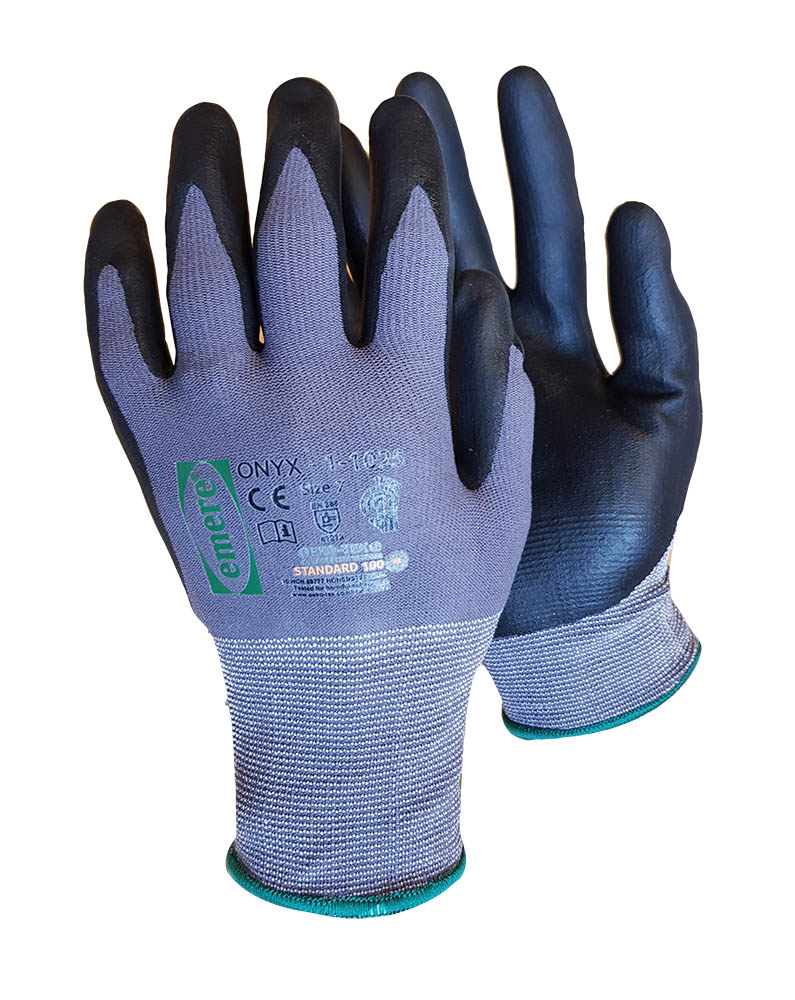Onyx är en stickad handske i nylon/lycra som är doppad i en skummad nitrilblandning i innerhand.